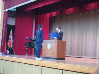 終業式では、「明日の“TOKYO”」作文コンクールとアール・エスポアール展での世田谷区長賞の表彰がありました。また、バスケットボール部、野球部が区内の新人大会等で優秀な成績を収めたので表彰されました。