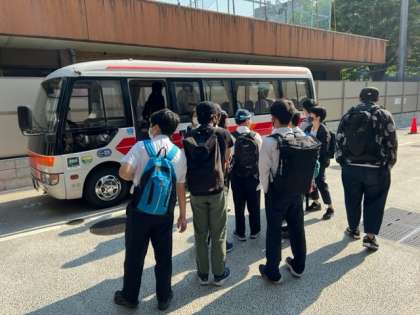 C組は小型バスで出発です。すでに日差しが眩しいです。