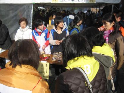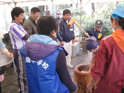ボランティアとして参加した本校の生徒たちは、お揃いの青いベストを着て、釜戸で薪をくべたり、つきたてのお餅にきなこやあんこをまぶしたりし、お餅とお菓子・ラムネの販売やポップコーンの配布など、たくさんの仕事のお手伝いをしていました。