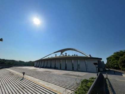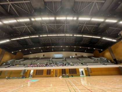 駒沢公園の屋内球技場で行っている区内の合同球技大会に参加しています。とても立派な会場です。