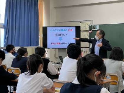 単に税の種類を学ぶのではなく、解決すべき社会の課題について、現在と将来の世の中に目を向けながら学ぶことができる有意義な授業でした。生徒たちの中にはうなずきながらメモを取っている子もいました。