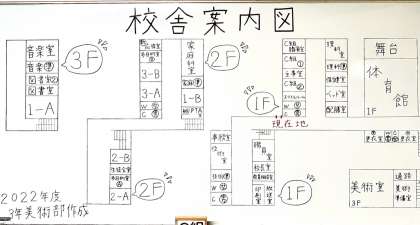 工事中で教室配置が変わりました。校舎案内図の書き換えが必要になったのですが、美術部が引き受けてくれました。見やすくてGOODです。