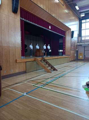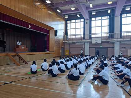 校長先生や生活指導主任の先生から話がありました。また、都大会出場を決めたバドミントン部の表彰もありました。