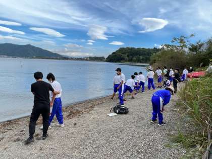 河口湖学園に到着してオヤツタイム。そのあと、まだ元気が残っている生徒が学園横の河口湖岸を散策しました。
