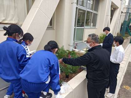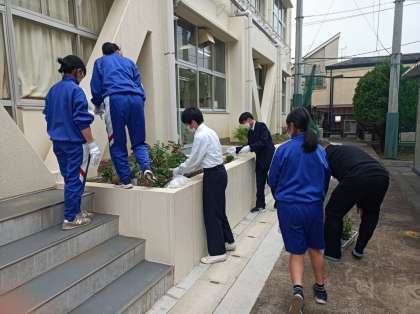 校長先生と一緒に花壇の整備などをするという「花ボランティア」が始まりました。週に一度、昼休みに有志の生徒が参加します。第一回は5人の生徒が参加し、校長先生と一緒に花壇に花を植えました。