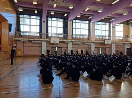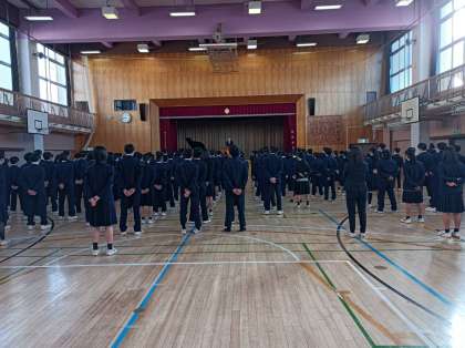 始業式の開始時間より前には、全生徒が静かに整列を完了させていました。始業式後は、生活指導主任より三学期の生活についての話がありました。