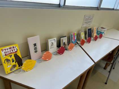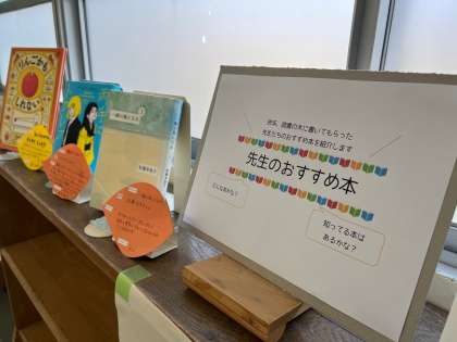 現在、学校図書館の特集ディスプレーでは、先生のおすすめ本を展示しています。