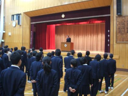 朝礼では、3年生が私立高校と都立高校の推薦入試の時期を迎え、体調管理をして入試に備えてほしいことと、1・2年生は1年後・2年後の自分の姿と重ね合わせ、それぞれ今からしっかりと学習に取り組むことが話されました。