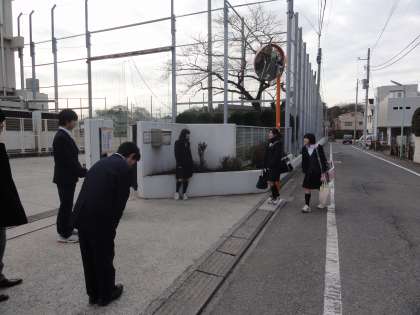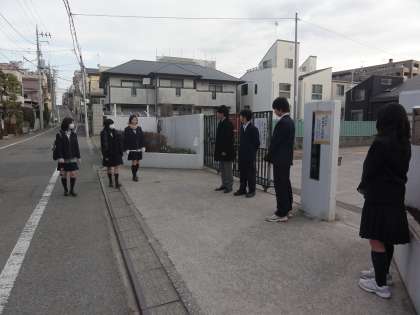 寒い中、朝早く校門の前にならび、登校してくる生徒や先生に挨拶しています。