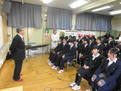 ライオンズクラブの会長の挨拶から始まり、警察の方のお話を聞いたり、薬物乱用防止のDVDを見たりしました。