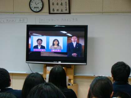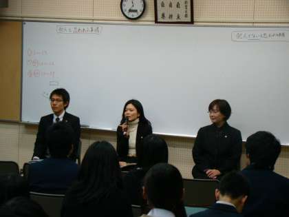 3月5日、3年生を対象に、第二東京弁護士会の弁護士4名に来ていただき、裁判員裁判を体験しました。生徒の興味・関心も高く、活発な意見交換が行われました。弁護士の方からは、裁判員としての心構えや、多面的にものを捉えることが大切であるといったお話をいただきました。将来、生徒たちの中から裁判員となる人もいると思います。この経験が活かされると良いと思います。