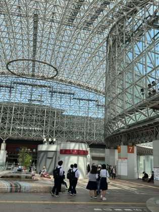 金沢駅付近を見学するグループ。まいどさんに案内していただいています。