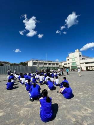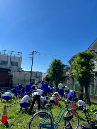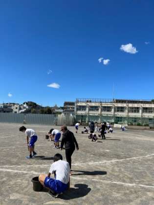 真夏のような空の下で、たくさんの生徒が、草取りや、校庭の小石拾いを頑張りました。