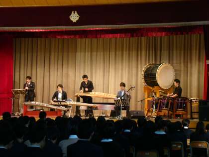 3月3日(土)本校体育館で、「EcKotoSuperStars」による和楽器のアンサンブルを鑑賞しました。古典音楽から現代音楽まで広くアレンジされており、生徒は音楽の授業で箏を弾いているので、さらに興味が高まったようでした。また、箏・三味線・尺八・和太鼓の歴史など楽器についてもお話ししてくださいました。