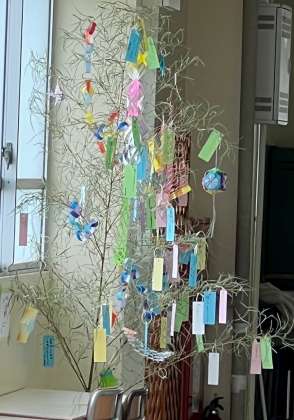 ちなみに、学校図書館の前の廊下には、七夕の願いを結ぶ笹が展示されています。警備主事さんが提供してくださり、用務主事さんと司書さんが飾ってくださいました。