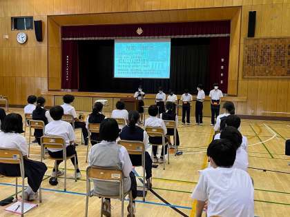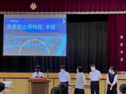 それぞれの班で、写真やiMovieでまとめた動画などをパワーポイントに載せて発表しました。科学博物館などの見学地で学んだことだけでなく、食事やおみくじのこと、ベストショットの解説やクイズなどもあり、どの班も工夫を凝らしていました。