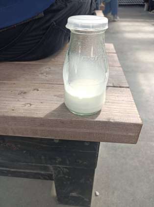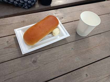 生クリームを5分間程度振り続け、自作バターで米粉のパンを食べました。