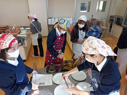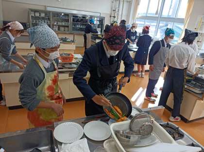 本日、2年生が家庭科で調理実習を行いました。地域の方の協力もあり、どの班もスムーズに調理できていました。