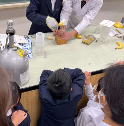 本日、2年生は調理実習を行っていますが、1年生は、教育委員会から講師をお招きして理科の実験を行っています。液体窒素を使って超低温の世界を体験しています。