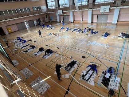 C組が書初めの練習をしています。体育館で練習するのは3回目。書初め用紙にバランスよく書けるようになってきました。集中しています。