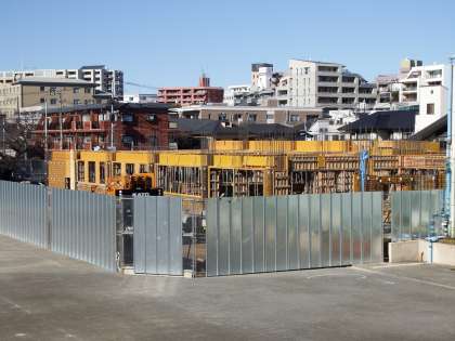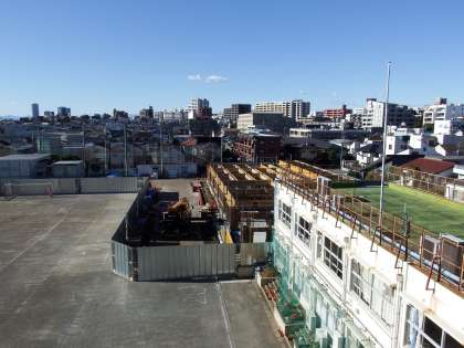 本校校舎の西側半分の新築工事の進捗状況です。基礎工事に時間をかけていたようですが、1階のフロアらしきものができたら、年末あっという間にその上が伸びてきました。