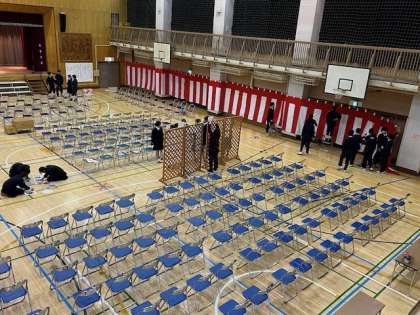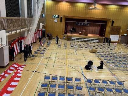 放課後、2年生は明日の立青式に向けて会場準備をしています。