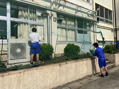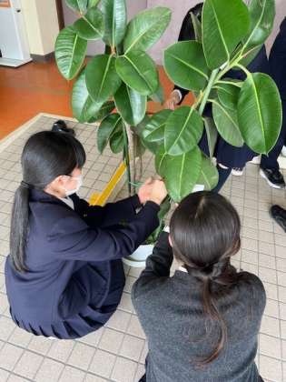 今月唯一の花ボランティアでは、花壇の植物への液肥やりと、体育館入り口にある観葉植物の葉っぱ拭きをしました。きれいになったゴムの葉っぱは生き生きと呼吸ができるようになりました。