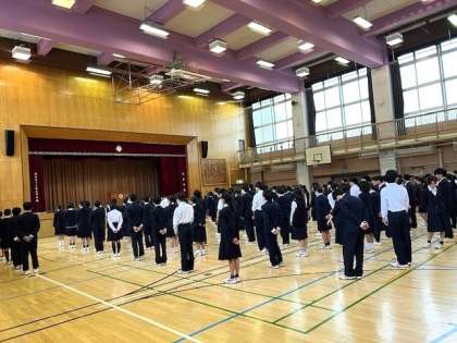 本校では、全校朝礼とは別に、生徒会が開催する生徒朝礼を毎月行っています。今年度初めての生徒朝礼ですが、定刻まえに整列し、しかも静まり返った状態でした。さすがです。