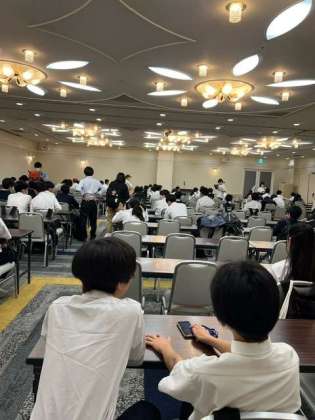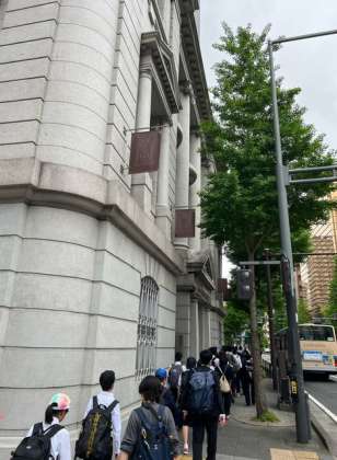 3年生とC組は集合完了です。集合場所のビルの向こうは山下公園です。