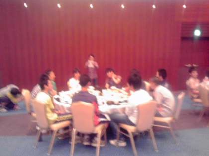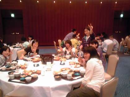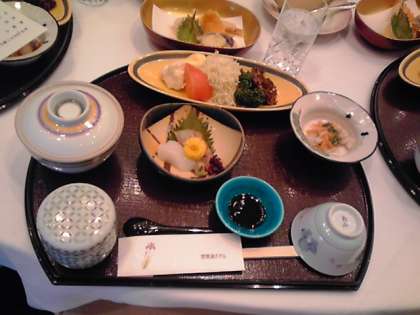 2日目の夕食は和食です。メニューは…貝柱のマリネ、お刺身(鯛、鳥賊)、茶碗蒸し、牛肉時雨煮、サラダ、天麩羅(海老、鱚、大葉、茄子)、きつねうどん、豚角煮、吸い物、御飯、果物(メロン)
