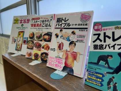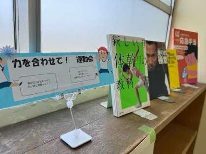 現在の学校図書館入り口手前のディスプレーは、運動会にちなんだものです。ぜひ、参考に。