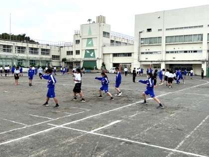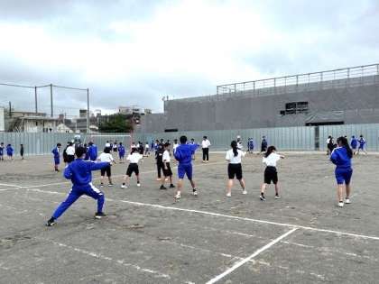 運動会練習が本格的になってきましたが、今日の全体練習は、先日の全校校外学習のときの縦割り班で練習しています。3年生がリードして、空手の演武の練習です。