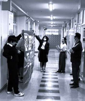 放課後、美術部の生徒たちが、職員室に運動会のスローガンの入った横断幕をお披露目に来てくれました。毎年、時間をかけてかなりの力作を作っていますが、今回も目を見張る出来栄え。芸術作品になりました。当日の楽しみにここでは、白黒の写真で。