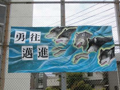 作成した美術部から「1つの目標に向かって、仲間と協力し、突き進む姿をオオカミに例えて描きました。」と旗の紹介がありました。