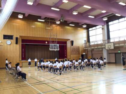 6時間目、1年生は河口湖移動教室に向けた学年集会を行っています。