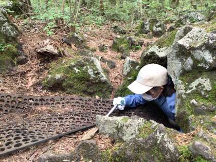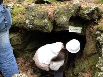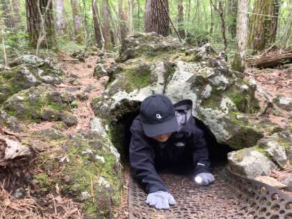 中は涼しく、真っ暗。数名が懐中電灯で明かりを照らして進みます。