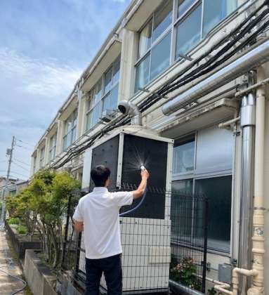 あまりに暑いので、一部の教室のエアコンの効きが低下しています。業者からのアドバイスで、室外機を冷やしているところです。