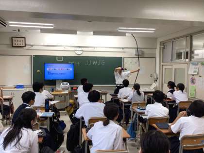授業の後半には弓道の道衣姿の先生が登場し、教室はたいへん盛り上がりました。