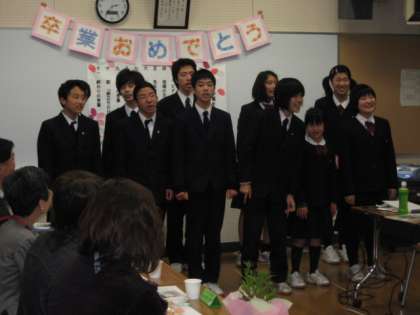 「卒業を祝う会」では、C組の1・2年生、保護者、地域の方々、先生方が一緒になってお祝いしました。この会の最後には、卒業生が一人一言ずつ皆様に向けてお礼をいいました。