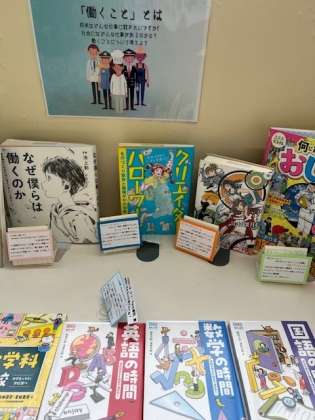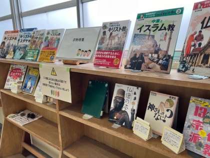 1年生が社会科で宗教について学習するので、社会科の講師の先生が、司書さんに依頼して並べていただきました。また、2年生が来週に職場体験を予定しているので、関連本を。