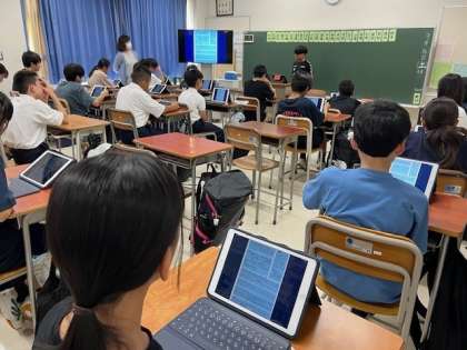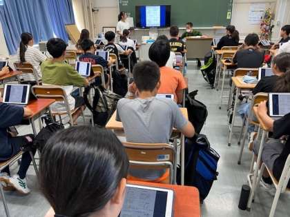 1年生は夏休みに取り組んだ職業調べ新聞を発表しています。小学校ですでに習得しているロイロを使った編集方法を駆使して新聞形式で上手にまとめています。口頭での発表も緊張しながら頑張っています。