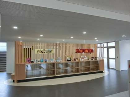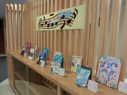 新校舎の昇降口入ってすぐのカウンターに、図書館の本の紹介コーナーができました。 図書館司書さんの手作りです。