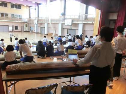 午前中はC組が琴の演奏をしていました。太鼓に合わせて弦をはじく練習を重ねています。