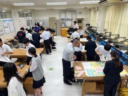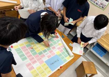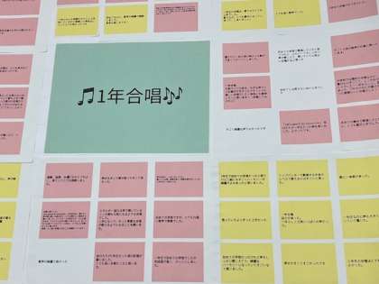 放課後、なにやら活気のある声が聞こえていると思ったら、生徒全員による学芸発表会の振り返りメッセージカードを、実行委員のみんなが掲示できるようにまとめる作業をしていました。