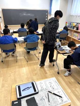 1年C組は、「季節の言葉『秋』」の作成中。筆ペンで味のある字を書いて、挿絵を書き添えて。素敵な作品が完成間近。