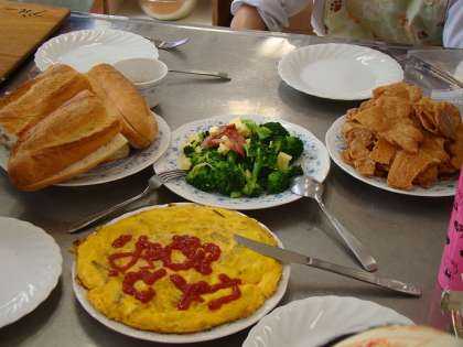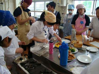 C組では二週間に一度、調理実習を行っています。調理に必要な材料や分量を勉強し、地域の方々にご協力をいただきながら、自分たちの足で商店街に買い物に行っています。隔週で行うことで、調理に必要な基本的な技能が身についてきました。写真は、トルティーヤをパンにはさんで食べるボカティージョというスペイン料理です。