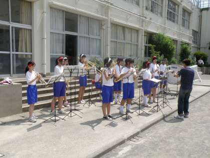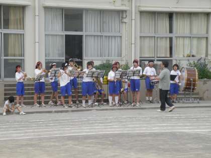 開会式での入場行進と優勝杯返還、また閉会式では成績発表や表彰・優勝杯授与で運動会を盛り上げてくれ、最後の校歌斉唱も皆さんの伴奏で全員がしっかり歌えました。