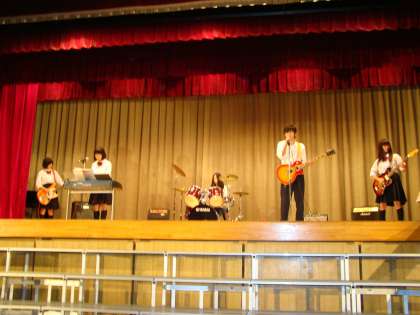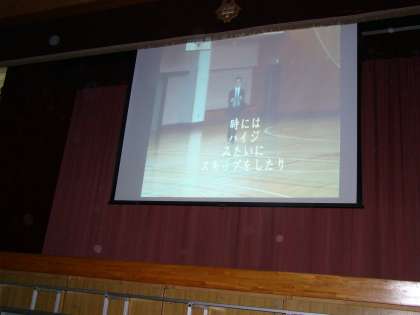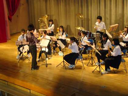 「吹奏楽部の演奏」「2年教科「日本語」(表現)の八幡中学校のCM上映」「子バンドの演奏」の様子です。