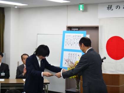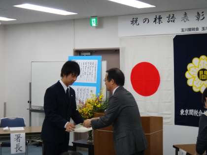 11月9日、玉川税務署において、玉川関税会が主催する「中学生の税の標語」の表彰が行われました。毎年、本校では3年生が応募していますが、今年は、以下の2名が表彰されました。おめでとうございます。