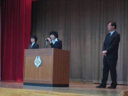 始めに、社会科の細田真理子先生と美術科の野口昌代先生の2名の教育実習生が紹介されました。教師に近づく大きな一歩としてがんばってほしいです。